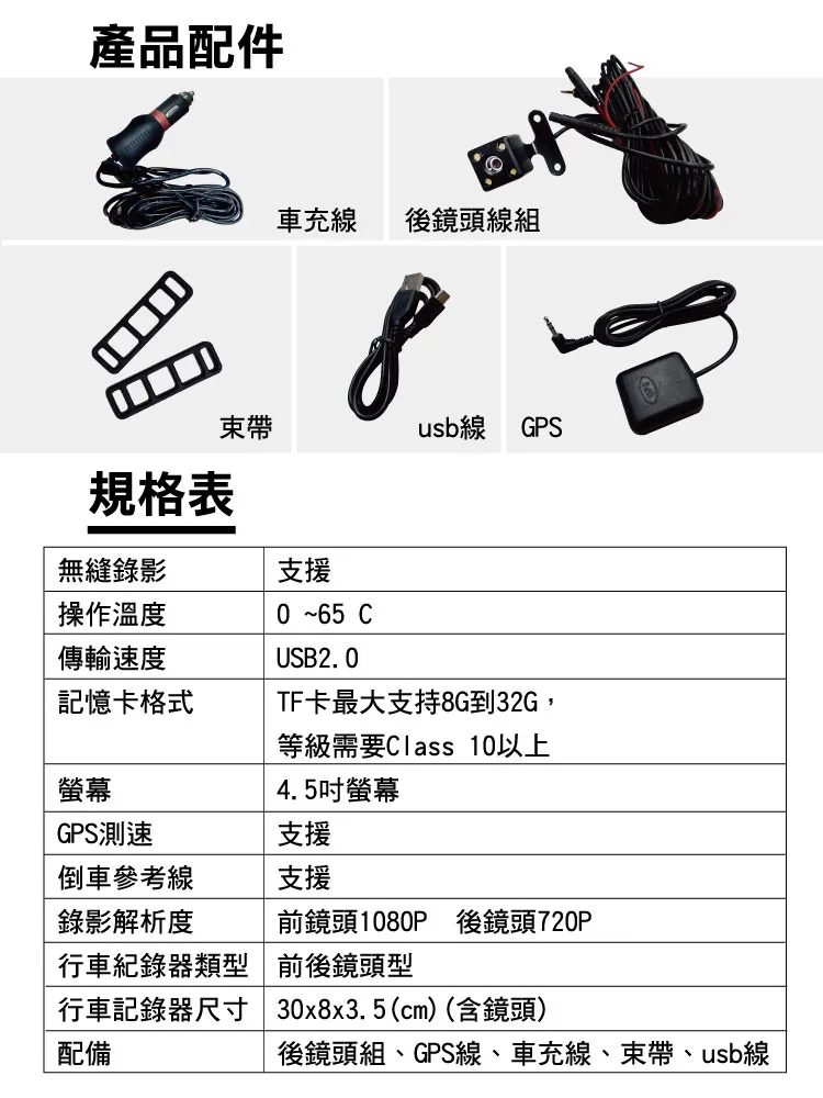 產品配件規格表車充線後鏡頭線組束usb線 GPS~65C無縫錄影支援操作溫度傳輸速度記憶卡格式螢幕GPS測速倒車參考線USB2.0TF卡最大支持8G到32G,等級需要Class 10以上4.5吋螢幕支援支援錄影解析度前鏡頭1080P 後鏡頭720P行車紀錄器類型行車記錄器尺寸配備前後鏡頭型30x8x3.5(cm)(含鏡頭)後鏡頭組、GPS線、車充線、帶、usb線