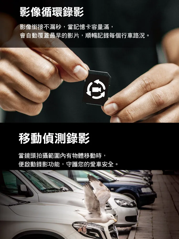 影像循環錄影影像銜接不漏秒,當記憶卡容量滿,會自動覆蓋最早的影片,順暢記錄每個行車路況。移動偵測錄影當鏡頭拍攝範圍內有物體移動時,便啟動錄影功能,守護您的愛車安全。