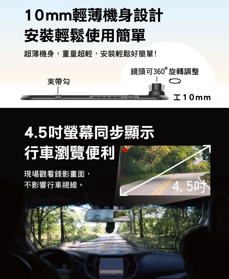 10mm輕薄機身設計安裝輕鬆使用簡單超薄機身,重量超輕,安裝輕鬆好簡單!束帶勾鏡頭可360°旋轉調整4.5螢幕同步顯示行車瀏覽便利現場觀看錄影畫面,不影響行車視線。10mm4.5吋