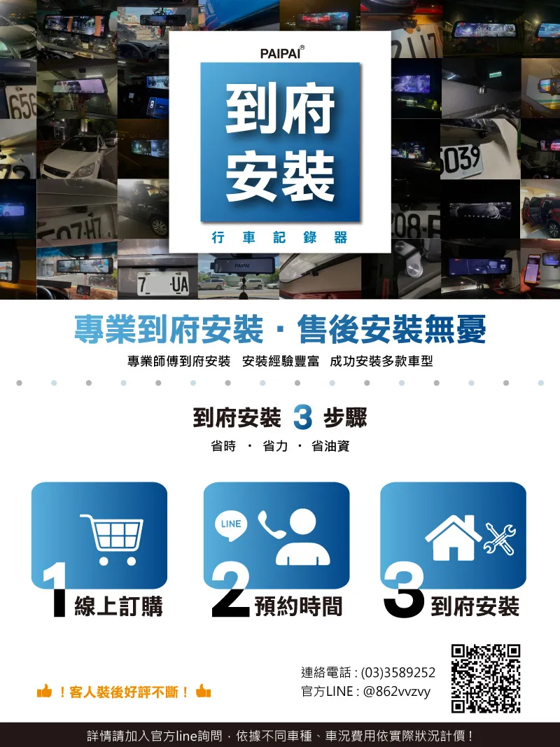 56PAIPAIⓇ到府安裝行車記錄器7 UA039專業到府安裝售後安裝無憂專業師傅到府安裝 安裝經驗豐富 成功安裝多款車型線上訂購到府安裝 3 步驟省時 省力 · 省油資LINE 預約時間36 到府安裝!客人裝後好評不斷!連絡電話:(03)3589252官方LINE:@862wzvy詳情請加入官方line詢問,依據不同車種、車況費用依實際狀況計價!