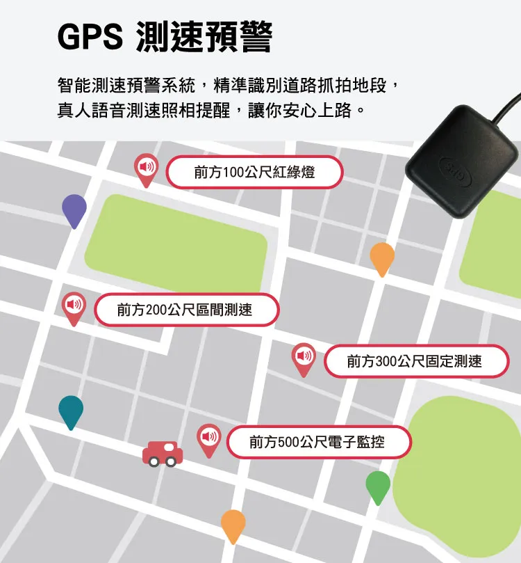 GPS測速預警智能測速預警系統,精準識別道路抓拍地段,真人語音測速照相提醒,讓你安心上路。前方100公尺紅綠燈前方200公尺區間測速前方300公尺固定測速前方500公尺電子監控