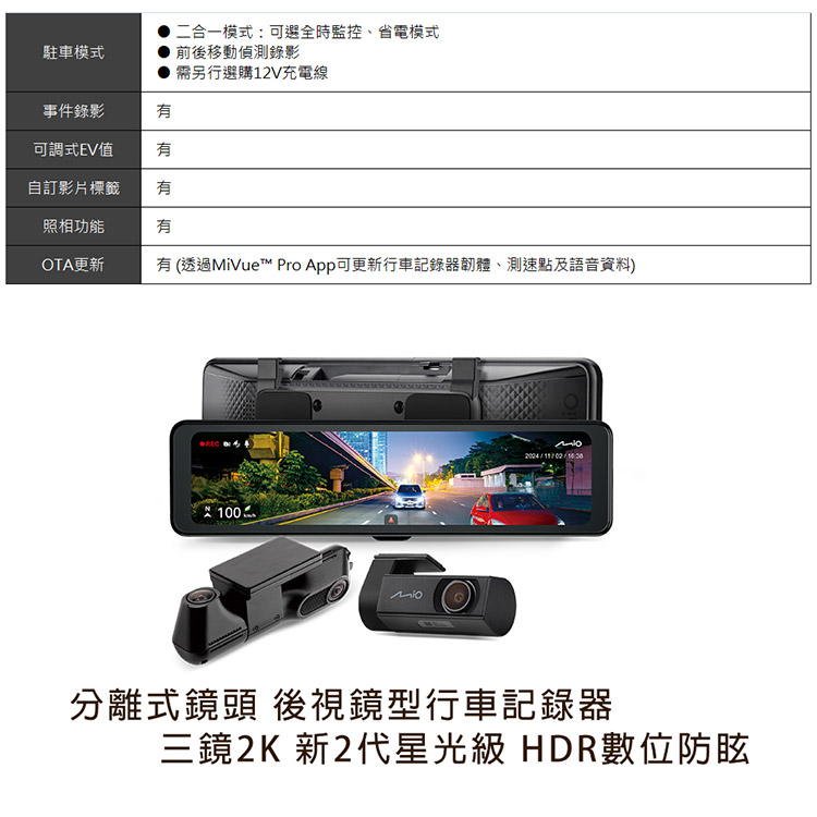 二合一模式可選全時監控、省電模式駐車模式前後移動偵測錄影需另行選購12V充電線事件錄影可調式EV值 自訂影片標籤照相功能OTA更新有 (透過MiVue™ Pro 可更新行車記錄器韌體、測速點及語音資料100:分離式鏡頭 後視鏡型行車記錄器三鏡2K 新2代星光級 HDR數位防眩