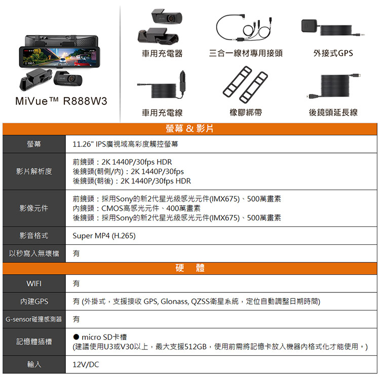 車用充電器三合一線材專用接頭外接式GPSMiVue R888W3車用充電線橡膠綁帶後鏡頭延長線螢幕 & 影片螢幕11.26 IPS廣視域高彩度觸控螢幕前鏡頭2K 1440P/30fps HDR影片解析度後鏡頭(朝側/:2K1440P/30fps後鏡頭(朝後):2K 1440P/30fps HDR影像元件前鏡頭:採用Sony的新2代星光級感光元件(IMX675)、500萬畫素內鏡頭:CMOS高感光元件、400萬畫素後鏡頭:採用Sony的新2代星光級感光元件(IMX675)、500萬畫素影音格式Super MP4 (H.265)以秒寫入無壞檔硬體WIFI內建GPS (外掛式,支援接收 GPS, Glonass, QZSS衛星系統,定位自動調整日期時間)G-sensor碰撞感測器有記憶體插槽輸入micro SD卡槽(建議使用U3或V30以上,最大支援512GB,使用前需將記憶卡放入機器內格式化才能使用)12V/DC