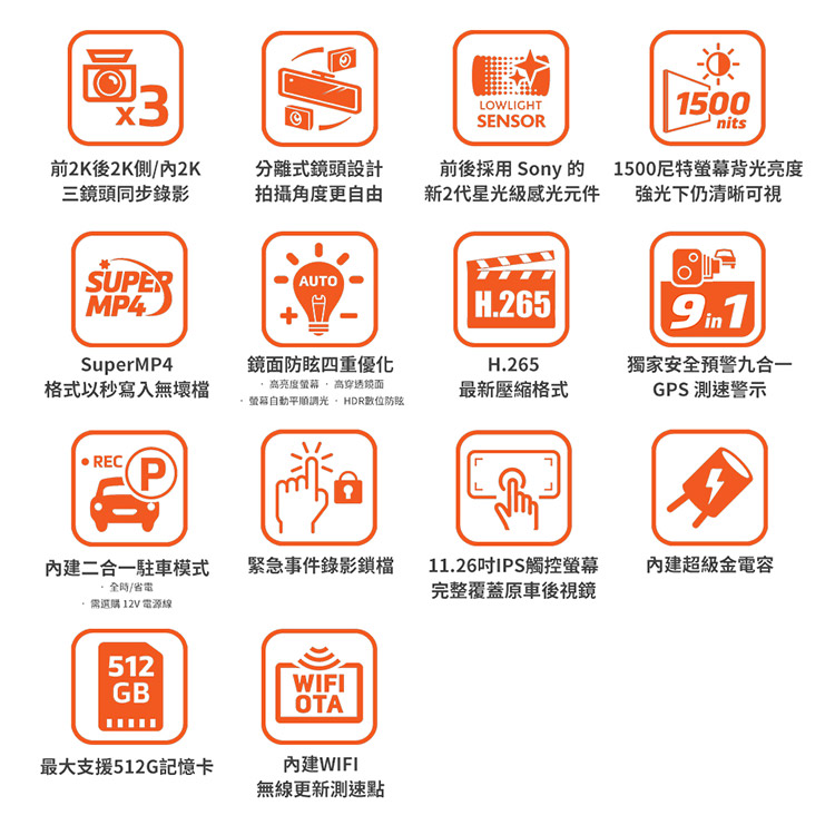 LOWLIHTSENSOR1500nits前2K後2K側2K三鏡頭同步錄影式鏡頭設計拍攝角度更自由前後採用 Sony 的新2代星光級感光元件1500尼特背光強光下仍清晰可視SUPERSuperMP4AUTO防眩四重優化以寫入無壞檔亮度穿透鏡面螢幕自動平順調光 HDR數位防眩 H.265H.265最新壓縮格式獨家安全預警九合一GPS測速警示/(PG內建二合一駐車模式緊急事件錄影鎖檔全時/省電選購12V電源線11.26吋IPS觸控螢幕完整覆蓋原車後視鏡內建超級金電容512GB最大支援512G記憶卡WIFIOTA內建WIFI無線更新測速點