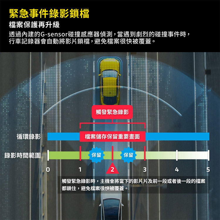 緊急事件錄影鎖檔檔案保護再升級透過內建的G-sensor碰撞感應器偵測,當遇到劇烈的碰撞事件時,行車記錄器會自動將影片鎖檔,避免檔案很快被覆蓋。觸發緊急錄影循環錄影檔案儲存保留重要畫面錄影時間範圍保留保留3124「觸發緊急錄影時,主機會將當下的影片片及前一段或者後一段的檔案都鎖住,避免檔案很快被覆蓋。5