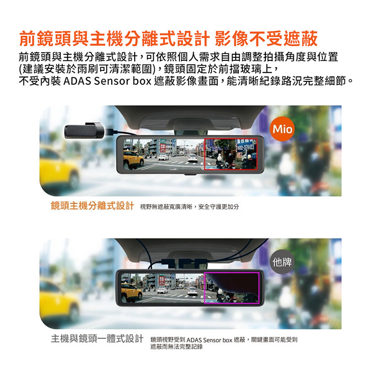 前鏡頭與主機分離式設計 影像不受遮蔽前鏡頭與主機分離式設計,可依照個人需求自由調整拍攝角度與位置(建議安裝於雨刷可清潔範圍),鏡頭固定於前擋玻璃上,不受 ADAS Sensor box 遮蔽影像畫面,能清晰紀錄路況完整細節。鏡頭主機分離式設計 視野無遮蔽清晰,安全守護更加分Mio主機與鏡頭一體式設計 鏡頭視野受到 ADAS Sensor box 遮蔽,關鍵可能受到遮蔽而無法完整記錄