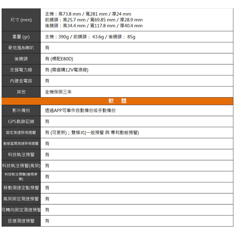 尺寸(mm主機:高73.8 mm/281mm/ 24 mm前鏡頭:高25.7mm/寬69.85mm/厚28.9mm後鏡頭:高34.4 mm/寬117.8mm / 厚40.4mm重量(gr)主機:390g/前鏡頭:43.6g/後鏡頭:85g麥克風&喇叭後鏡頭 (標配E80D)支援電力線 (需選購12V電源線)內建金電容其他全機保固三年軟體影片備份透過APP可事件自動備份或手動備份GPS軌跡記錄固定測速照相提醒 (可更新);雙模式(一般 與 專利動態預警)動態區間測速照相提醒科技執法預警 科技執法預警(高架) 科技執法預警(違規停 有車) 移動測速定點預警 有高架固定測速預警有可轉向固定測速預警有匝道測速預警 有