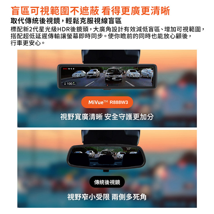 盲區可視範圍不遮蔽 看得更廣更清晰取代傳統後視鏡,輕鬆克服視線盲區標配新2代星光級HDR後鏡頭,大廣角設計有效減低盲區、增加可視範圍,搭配超低延遲傳輸讓螢幕即時同步。使你瞻前的同時也能放心顧後,行車更安心。100 R888W3視野寬廣清晰 安全守護更加分傳統後視鏡視野窄小受限 兩側多死角