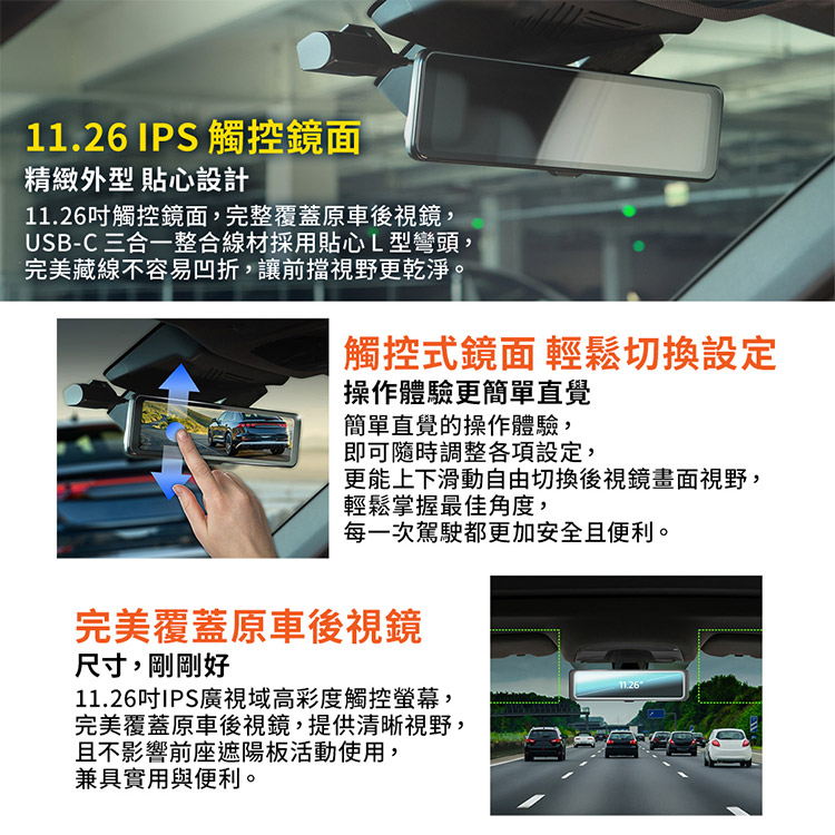 11.26 IPS 觸控鏡面精緻外型貼心設計11.26吋觸控鏡面,完整覆蓋原車後視鏡,USB-C 三合一整合線材採用貼心L型彎頭,完美藏線不容易凹折,讓前擋視野更乾淨。觸控式鏡面 輕鬆切換設定操作體驗更簡單直覺簡單直覺的操作體驗,即可隨時調整各項設定,更能上下滑動自由切換後視鏡畫面視野,輕鬆掌握最佳角度,每一次駕駛都更加安全且便利。完美覆蓋原車後視鏡尺寸,剛剛好11.26吋IPS廣視域高彩度觸控螢幕,完美覆蓋原車後視鏡,提供清晰視野,且不影響前座遮陽板活動使用,兼具實用與便利。11.26