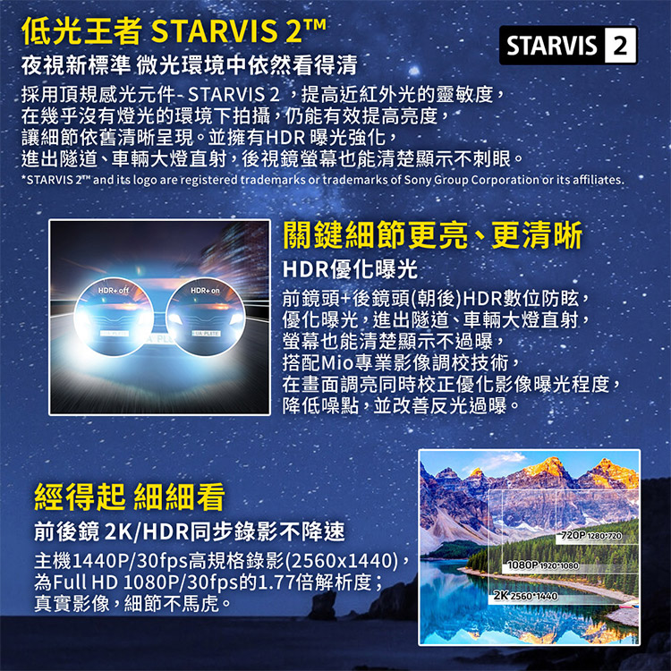 低光王者 STARVIS 2TM夜視新標準 微光環境中依然看得清採用頂規感光元件STARVIS 2,提高近紅外光的靈敏度,在幾乎沒有燈光的環境下拍攝,仍能有效提高亮度,讓細節依舊清晰呈現。並擁有HDR曝光強化,STARVIS 2進出隧道、車輛大燈直射,後視鏡螢幕也能清楚顯示不刺眼。STARVIS 2 and its logo are registered trademarks or trademarks of Sy Group Corporation or its affiliates.關鍵細節更亮、更清晰HDR優化曝光HDR+offHDR+ on前鏡頭+後鏡頭(朝後)HDR數位防眩,優化曝光,進出隧道、車輛大燈直射,A PL螢幕也能清楚顯示不過曝,搭配Mio專業影像調校技術,在畫面調亮同時校正優化影像曝光程度,降低噪點,並改善反光過曝。經得起 細細看前後鏡 2K/HDR同步錄影不降速主機1440P/30fps高規格錄影(2560x1440),為Full HD 1080P/30fps的1.77倍解析度;真實影像,細節不馬虎。-720P 12807201080P192010802K-2560*