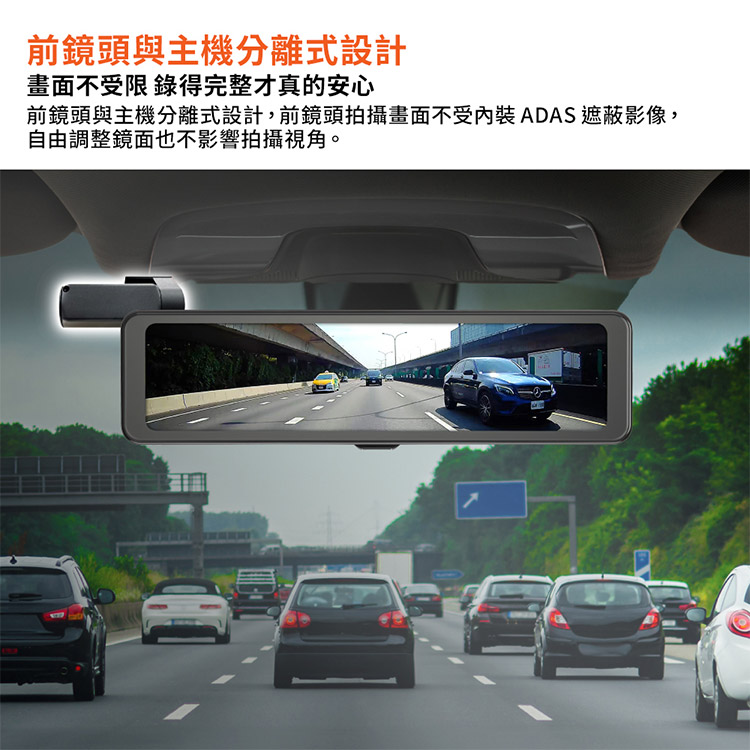 前鏡頭與主機分離式設計畫面不受限 錄得完整才真的安心前鏡頭與主機分離式設計,前鏡頭拍攝畫面不受ADAS 遮蔽影像,自由調整鏡面也不影響拍攝視角。