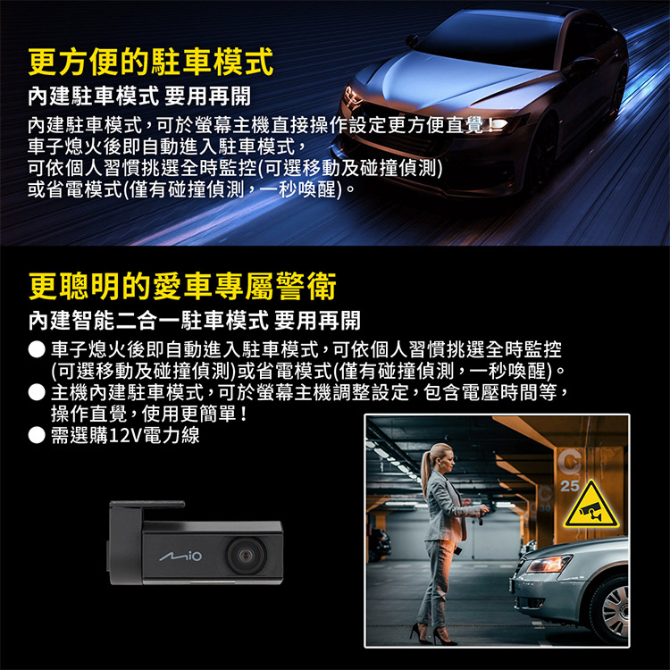 更方便的駐車模式內建駐車模式 要用再開內建駐車模式,可於螢幕主機直接操作設定更方便直覺!車子熄火後即自動進入駐車模式,可依個人習慣挑選全時監控(可選移動及碰撞偵測)或省電模式(僅有碰撞偵測,一秒喚醒)。更聰明的愛車專屬警衛內建智能二合一駐車模式 要用再開● 車子熄火後即自動進入駐車模式,可依個人習慣挑選全時監控(可選移動及碰撞偵測)或省電模式(僅有碰撞偵測,一秒喚醒)。主機內建駐車模式,可於螢幕主機調整設定,包含電壓時間等,操作直覺,使用更簡單!需選購12V電力線25