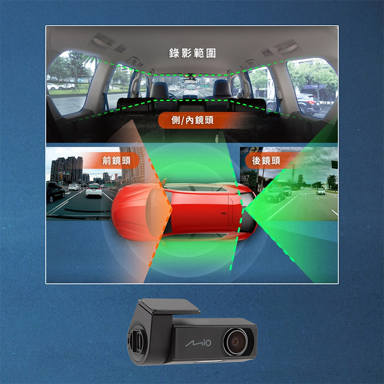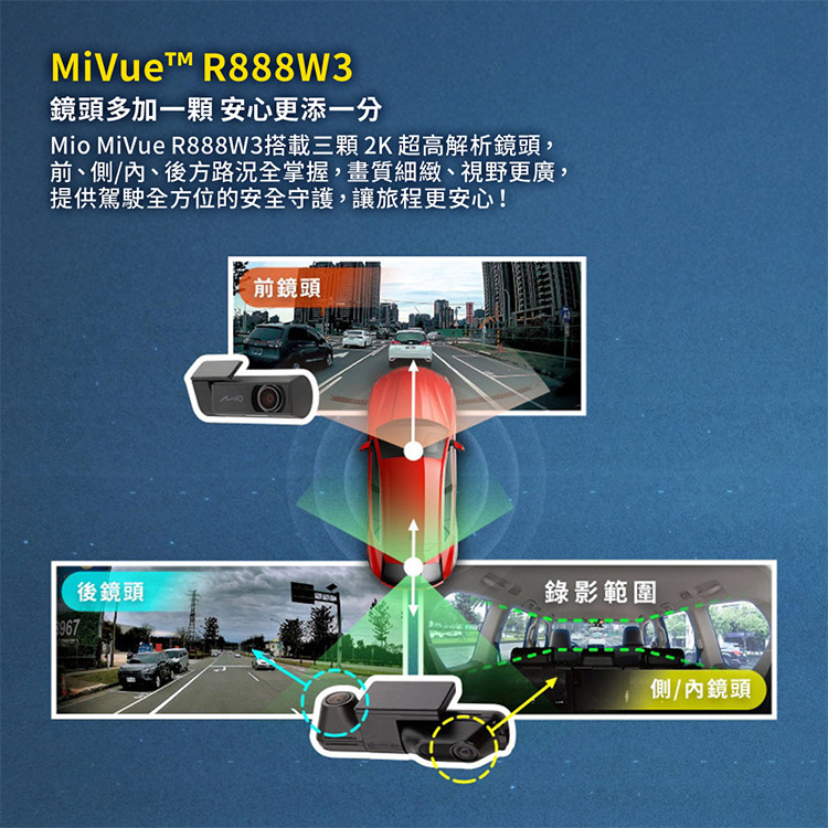 MiVuet R888W3鏡頭多加一顆 安心更添一分Mio MiVue R888W3搭載三顆 2K超高解析鏡頭,前、側/內、後方路況全掌握,畫質細緻、視野更廣,提供駕駛全方位的安全守護,讓旅程更安心!前鏡頭967後鏡頭錄影範圍側/內鏡頭