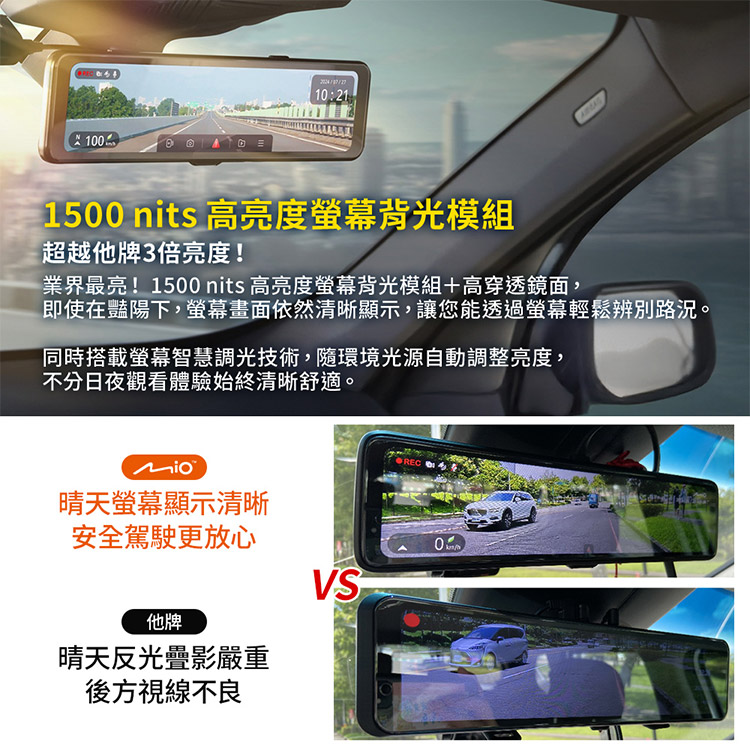 10:211500 nits 高亮度螢幕背光模組超越他牌3倍亮度!業界最亮!1500 nits 高亮度螢幕背光模組+高穿透鏡面,即使在豔陽下,螢幕畫面依然清晰顯示,讓您能透過螢幕輕鬆辨別路況。同時搭載螢幕智慧調光技術,隨環境光源自動調整亮度,不分日夜觀看體驗始終清晰舒適。晴天螢幕顯示清晰REC安全駕駛更放心VS他牌晴天反光疊影嚴重後方視線不良