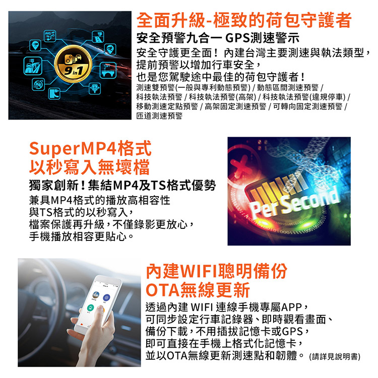 91全面升級-極致的荷包守護者安全預警九合一 GPS測速警示安全守護更全面!內建台灣主要測速與執法類型,提前預警以增加行車安全,也是您駕駛途中最佳的荷包守護者!測速雙預警(一般與專利動態預警)動態區間測速預警/科技執法預警/科技執法預警(高架)/科技執法預警(違規停車)/移動測速定點預警/高架固定預警/可轉向固定測速預警/匝道測速預警SuperMP4格式以秒寫入無壞檔獨家創新!集結MP4及TS格式優勢兼具MP4格式的播放高相容性與TS格式的以秒寫入,檔案保護再升級,不僅錄影更放心,手機播放相容更貼心。Per Second內建WIFI聰明備份OTA無線更新透過內建 WIFI連線手機專屬APP,可同步設定行車記錄器即時觀看畫面、備份下載,不用插拔記憶卡或GPS,即可直接在手機上格式化記憶卡,並以OTA無線更新測速點和韌體。(請詳見說明書)
