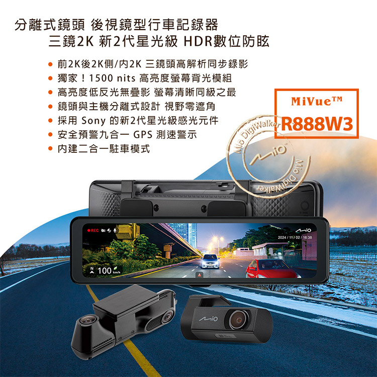 分離式鏡頭 後視鏡型行車記錄器三鏡2K 新2代星光級 HDR數位防眩 前2K後2K側2K 三鏡頭高解析同步錄影獨家!1500 nits 高亮度螢幕背光模組 高亮度低反光無疊影 螢幕清晰同級之最 鏡頭與主機分離式設計 視野零遮角採用 Sony 的新2代星光級感光元件安全預警九合一 GPS測速警示 二合一駐車模式MiVue R888W3REC100/ 2024/11/02/1638