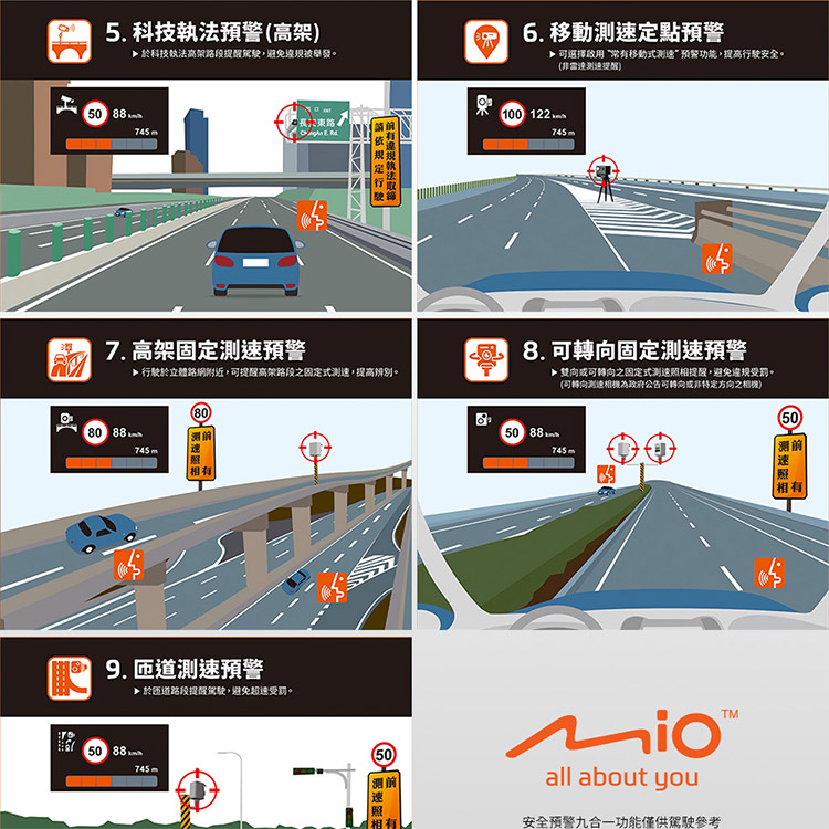 5. 科技執法高架▶於科技執法高架路段提醒駕駛,避免被舉發。. 移動測速定點預警▶ 選擇用“常有移動式測速預警功能,提高行駛安全。非提醒 745m長東路( 122 745m7. 高架固定預警 ▶ 行駛於立體路網附近,可提醒高架路段之固定式測速,提高辨別。745m(80)相有8. 可固定速預警▶ 雙向或可之固定式測速照相提醒,避免違規受罰。(可轉向测速為政府公告可轉向特定方向之)(50 88 )745m50测照相有6 9.匝道測速預警▶於匝道路段提醒駕駛,避免超速受罰。50 88745m50相有all about you安全預警九合一功能僅供駕駛參考