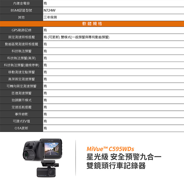 內建金電容BSMI認證型號N724W其他三年保固軟體規格GPS軌跡記錄有固定測速照相提醒有 (可更新 雙模式(一般預警與專利動態預警)動態區間測速照相提醒 有科技執法預警有科技執法預警(高架)有科技執法預警(違規停車) 移動測速定點預警高架固定測速預警可轉向固定測速預警有有有匝道測速預警有抬頭顯示模式有定速巡航提醒有事件錄影有可調式EV值有OTA更新有MiVuet C595WDS星光級 安全預警九合一雙鏡頭行車記錄器