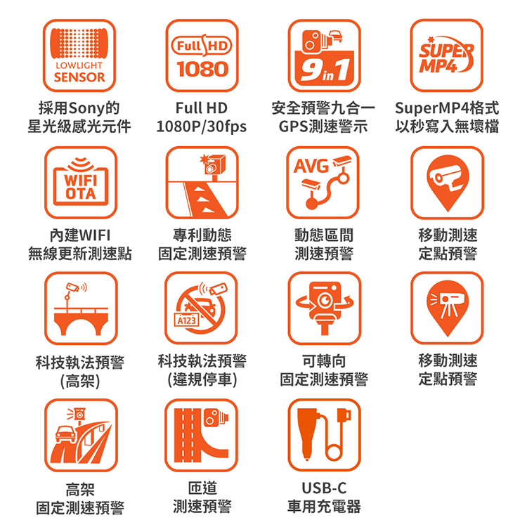 LOWLIGHTSENSORFull HD)10809in1採用Sony的Full HD星光級感光元件1080P/30fps安全預警九合一GPS測速警示SUPERMP4SuperMP4格式以秒寫入無壞檔荀AVGWIFIOTA內建WIFI專利動態動態區間移動測速無線更新測速點固定測速預警測速預警定點預警A123科技執法預警(高架)科技執法預警(違規停車)可轉向固定測速預警移動測速定點預警]高架匝道USB-C固定測速預警測速預警車用充電器
