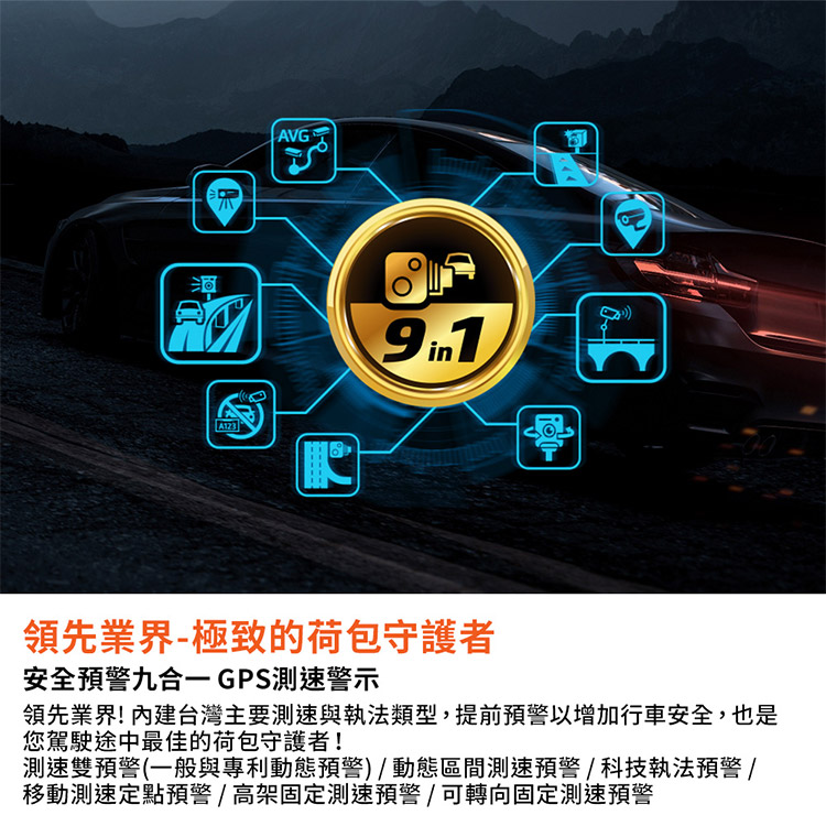 AVG領先業界-極致的荷包守護者安全預警九合一 GPS測速警示領先業界! 內建台灣主要測速與執法類型,提前預警以增加行車安全,也是您駕駛途中最佳的荷包守護者!測速雙預警(一般與專利動態預警)/動態區間測速預警/科技執法預警 /移動測速定點預警/高架固定測速預警/可轉向固定測速預警