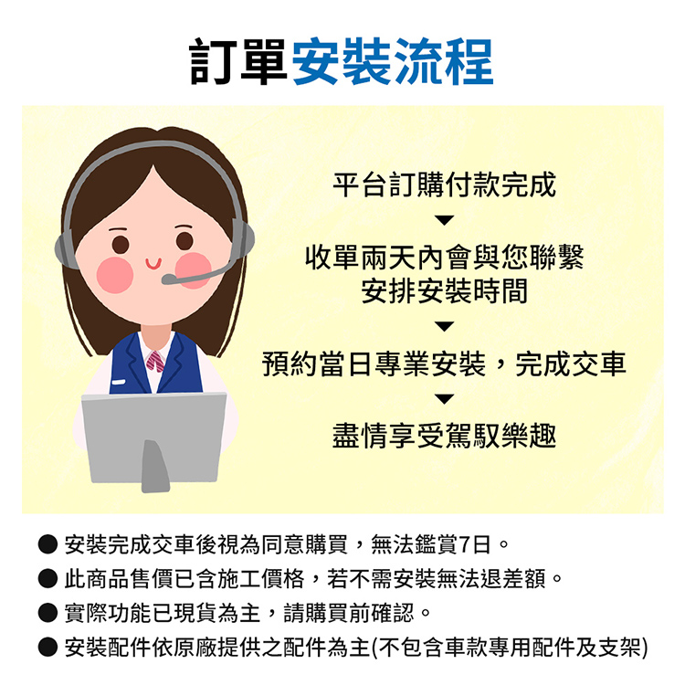 訂單流程平台訂購付款完成收單兩天內會與您聯繫安排時間預約當日專業安裝,完成交車盡情享受駕馭樂趣安裝完成交車後視為同意購買,無法鑑賞7日。此商品售價已含施工價格,若不需安裝無法退差額。實際功能已現貨為主,請購買前確認。安裝配件依原廠提供之配件為主(不包含車款專用配件及支架)