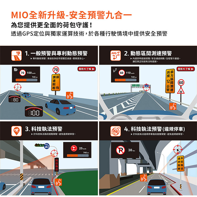 全新升級-安全九合一為您提供更全面的荷包守護!透過GPS定位與獨家運算技術,於各種行駛情境中提供安全預警 1.一般預警與專利動態預警AVG2. 動態區間速預警▶ 專利動態預警:車速愈快愈早提醒您減速,開車更安心。▶内建即時超速提醒/安全通過/全程警示畫面,讓您真正知道有沒有超速。88070看影片了解70 745m測相有3. 科技執預警▶於科技執法路段提醒駕駛,避免被發。60 110745m長前看影片了解12 60里速4. 科技執法預警違規停車▶於科技執法違規停車路段提醒駕駛,避免違規被舉發。() 745m 停技法