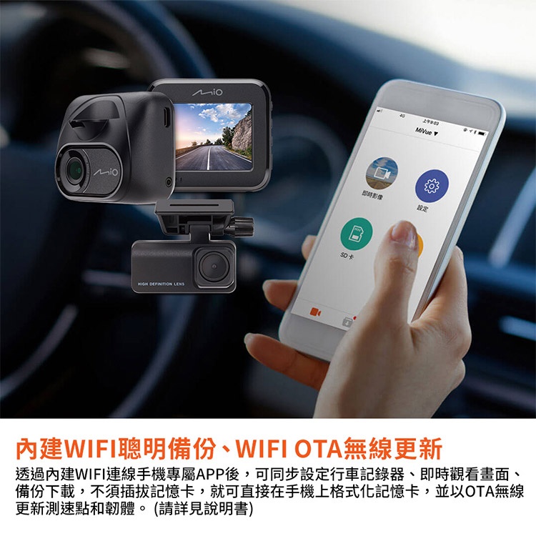 29903 即時影像設定內建WIFI聰明備份、WIFI OTA無線更新透過內建WIFI連線手機專屬APP後,可同步設定行車記錄器、即時觀看畫面、備份下載,不須插拔記憶卡,就可直接在手機上格式化記憶卡,並以OTA無線更新測速點和韌體。(請詳見說明書)