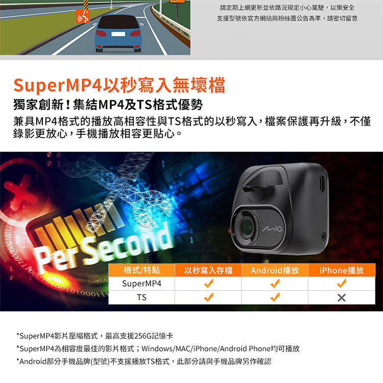請定期上網更新並依路況規定小心駕駛,以策安全支援型號依官方網站與粉絲團公告為準,請密切留意SuperMP4以寫入無壞檔獨家創新!集結MP4及TS格式優勢兼具MP4格式的播放高相容性與TS格式的以寫入,檔案保護再升級,不僅錄影更放心,手機播放相容更貼心。Per Second 格式/特點以秒寫入存檔Android播放iPhone播放SuperMP4TS*SuperMP4影片壓縮格式,最高支援256G記憶卡*SuperMP4為相容度最佳的影片格式;Windows/MAC/iPhone/Android Phone均可播放*Android部分手機品牌(型號)不支援播放TS格式,此部分請與手機品牌另作確認