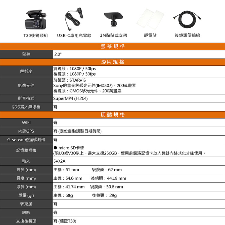 T30後鏡頭組 USB-C車用充電線3M黏貼式支架靜電貼後鏡頭線螢幕規格螢幕2.0影片規格解析度前鏡頭:1080P/30fps後鏡頭:1080P/30fps影像元件前鏡頭:STARVISSony的星光級感光元件(IMX307)、200萬畫素後鏡頭:CMOS感光元件、200萬畫素影音格式SuperMP4 (H.264)以秒寫入無壞檔WIFI建GPS有有(定位自動調整日期時間)硬體規格G-sensor碰撞感測器有記憶體插槽輸入micro SD卡槽(限U3或V30以上,最大支援256GB,使用前需將記憶卡放入機器內格式化才能使用。5V/2A高度(mm)寬度 (mm)厚度 (mm)重量(g)主機:61mm主機:54.6mm主機:41.74mm主機:68gp後鏡頭:62mm後鏡頭:44.19 mm後鏡頭:30.6 mm後鏡頭:29g麥克風有喇叭有支援後鏡頭有(標配T30)