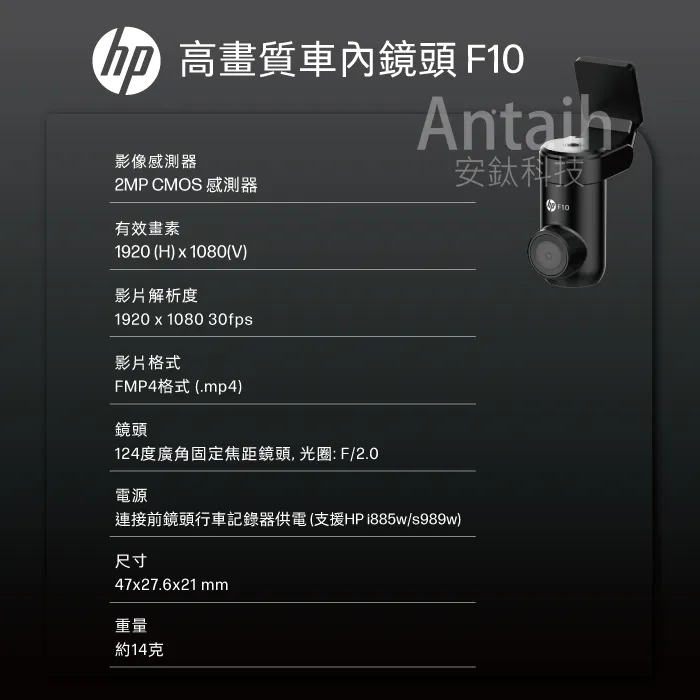 高畫質車內鏡頭 Antaih影像感測器2MP CMOS 感測器安鈦科技F10有效畫素1920 (H)1080(V)影片解析度1920 x 1080 30fps影片格式FMP4格式(.mp4)鏡頭124度廣角固定焦距鏡頭,光圈:F/2.0電源連接前鏡頭行車記錄器供電(支援HPi885w/s989w)尺寸47x27.6x21 mm重量約14克