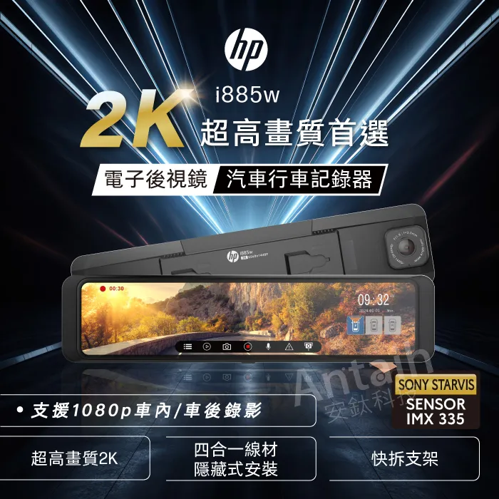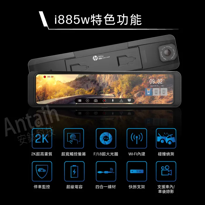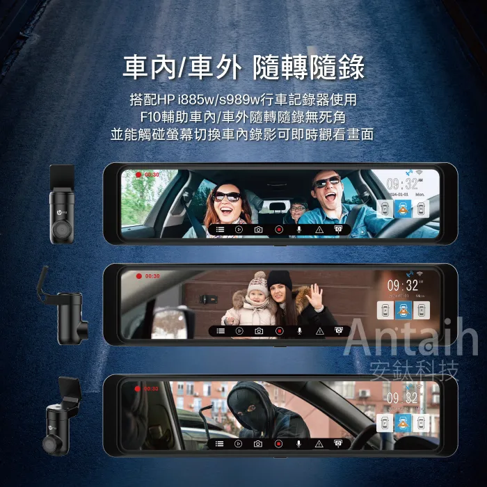 車內/車外 隨轉隨錄搭配HP i885w/s989w行車記錄器使用F10輔助車內/車外隨轉隨錄無死角並能觸碰螢幕切換車內錄影可即時觀看畫面00:3009:09:32Antaih安鈦科技09 32