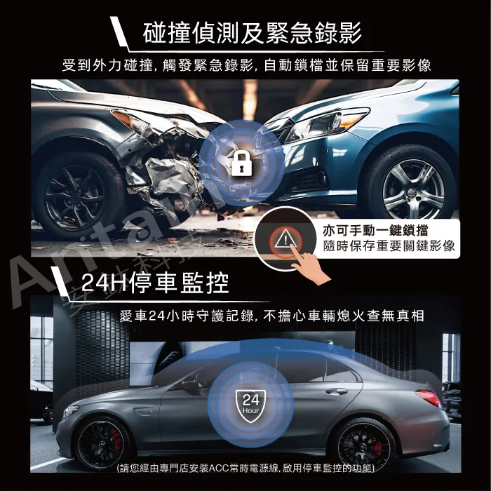 碰撞偵測及緊急錄影受到外力碰撞,觸發緊急錄影,自動鎖並保留重要影像亦可手動一鍵鎖擋隨時保存重要關鍵影像24H停車監控愛車24小時守護記錄,不擔心車輛熄火查無真相24Hour(請您經由專門店安裝ACC常時電源線,啟用停車監控的功能)