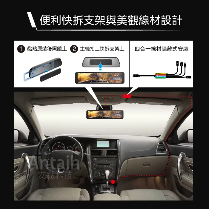 便利快拆支架與美觀線材設計 黏貼原裝後照鏡上2 主機扣上快拆支架上四合一線材隱藏式安裝安鈦科技