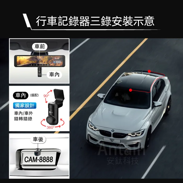 行車記錄器三錄安裝示意車前 「獨家設計/車外車內隨轉隨錄360車後CAM-8888安鈦科技