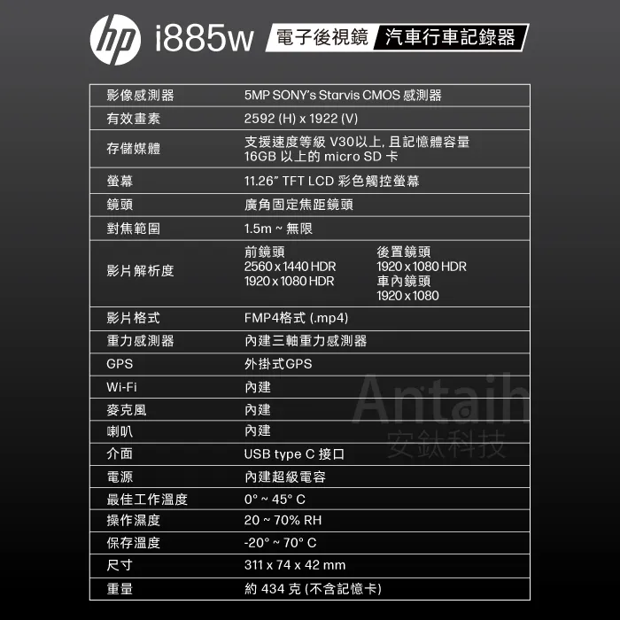 i885w 汽車行車記錄器影像感測器有效畫素5MP SONYs Starvis CMOS 感測器存儲媒體螢幕鏡頭2592 (H) x 1922 (V)支援速度等級 V3以上,且記憶體容量16GB 以上的 micro SD卡11.26 TFT LCD 彩色觸控螢幕廣角固定焦距鏡頭對焦範圍1.5m~無限前鏡頭後置鏡頭影片解析度2560x1440 HDR1920x1080 HDR1920x1080 HDR車內鏡頭1920x1080影片格式FMP4格式 (.mp4)重力感測器內建三軸重力感測器GPS外掛式GPSWi-Fi內建麥克風內建喇叭內建介面USB type C 接口安鈦科技電源內建超級電容最佳工作溫度操作濕度保存溫度尺寸重量0°~ 45° C20~70% RH-20°~70°C311 x 74 x 42 mm約434克 (不含記憶卡)