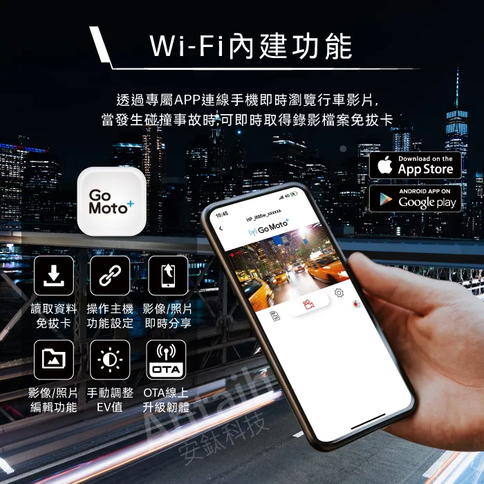 Wi-Fi內建功能透過專屬APP連線手機即時瀏覽行車影片,當發生碰撞事故時可即時取得錄影檔案免卡Moto10:45 Go 讀取資料 操作主機 影像/照片免拔卡功能設定 即時分享OTAOTA線上影像/照片 手動調整編輯功能EV值升級韌體安鈦科技Download on theApp StoreANDROID APP ONGoogle play
