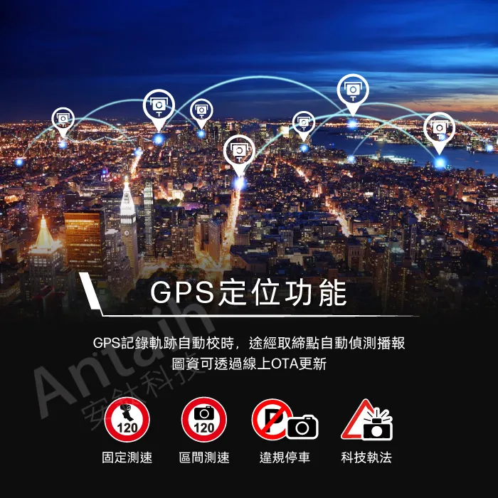 GPS定位功能GPS記錄軌跡自動校時,途經取締點自動偵測播報120圖資可透過線上OTA更新120固定測速 區間測速違規停車 科技執法