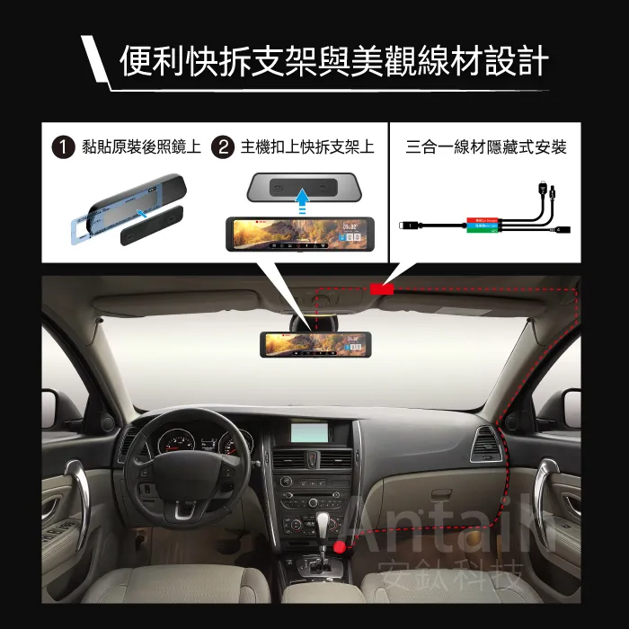 便利快拆支架與美觀線材設計 黏貼原裝後照鏡上2 主機扣上快拆支架上 三合一線材隱藏式安裝安鈦科技