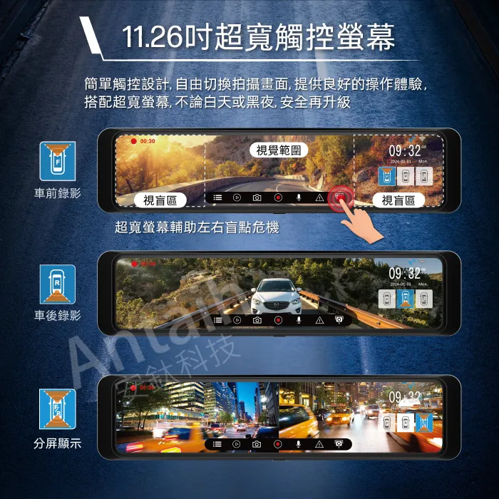 11.26超寬觸控螢幕簡單觸控設計,自由切換拍攝畫面,提供良好的操作體驗,搭配超寬螢幕,不論白天或黑夜,安全再升級00:30視覺範圍 車前錄影視盲區視盲區超寬螢幕輔助左右盲點危機車後錄影安鈦科技Δ分顯示: 09 09 32