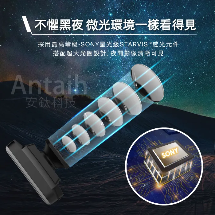 不懼黑夜 微光環境一樣看得見採用最高等級-SONY星光級STARVIS™感光元件搭配超大光圈設計,夜間影像清晰可見Antaih安鈦科技SONY