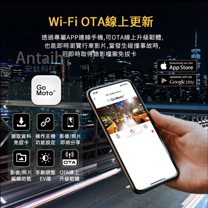 Wi-Fi OTA線上更新透過專屬APP連線手機,OTA線上升級韌體,也能即時瀏覽行車影片,當發生碰撞事故時,可即時取得影卡安鈦科技Moto10:45讀取資料 操作主機 影像/照片免拔卡功能設定 即時分享影像/照片 手動調整OTAOTA線上編輯功能EV值升級韌體 Go Download on theApp StoreANDROID APP ONGoogle play