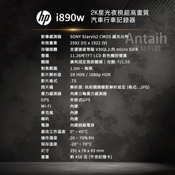 2K星光夜視超高畫質 汽車行車記錄器 i890w影像感測器有效畫素存儲媒體螢幕鏡頭SONY Starvis2 MOS 感光元件2592 (H) x 1922 (V)Antaih支援速度等級 V30以上的micro 科技11.26吋TFT LCD 彩色觸控螢幕廣角固定焦距鏡頭 | 光圈:F/1.551.5m~無限2K HDR / 1080p HDR.TS解析度:依前鏡頭錄影解析設定(格式:.JPG)對焦範圍影片解析度影片格式照片檔重力感測器內建三軸重力感測器GPSWi-Fi外掛式GPS內建麥克風內建喇叭內建電源最佳工作溫度內建超級電容0°~4520~70% RH-20°~70°C操作濕度保存溫度尺寸重量約456克(不含記憶卡)291 x 76 x 43mm