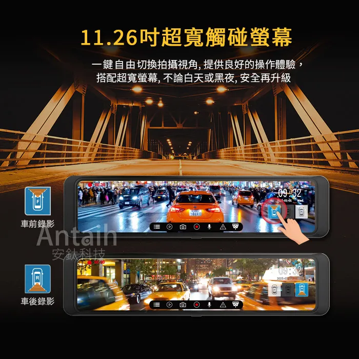 11.26超寬觸碰螢幕一鍵自由切換拍攝視角,提供良好的操作體驗,搭配超寬螢幕, 不論白天或黑夜,安全再升級車前錄影安鈦科技車後錄影Wed09:32