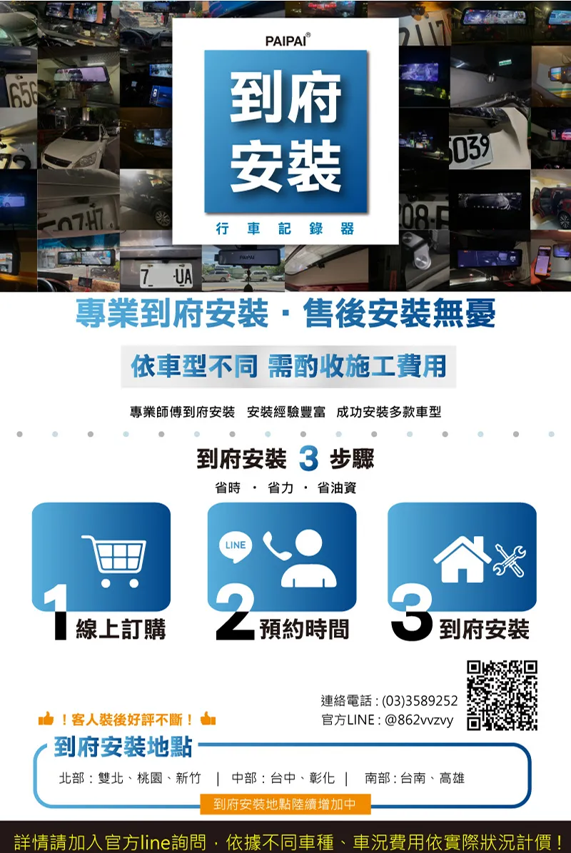 656PAIPAIⓇ到府安裝039行車記錄器 UA專業到府安裝·售後安裝無憂依車型不同 需酌收施工費用專業師傅到府安裝 安裝經驗豐富 成功安裝多款車型到府安裝 3 步驟省時省力省油資LINE線上訂購2預約時間 到府安裝!客人裝後好評不斷!到府安裝地點連絡電話:(03)3589252官方LINE:@862vvzvy北部:雙北、桃園、新竹 中部:台中、 南部:台南、高雄到府安裝地點陸續增加中詳情請加入官方line詢問,依據不同車種、費用依實際狀況計價!