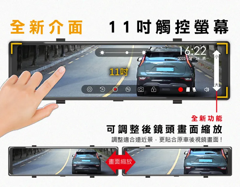 全新介面 11觸控螢幕1:222023 週一11吋6全新功能可調整後鏡頭畫面縮放調整適合遠近景,更合原車後視鏡畫面!畫面縮放