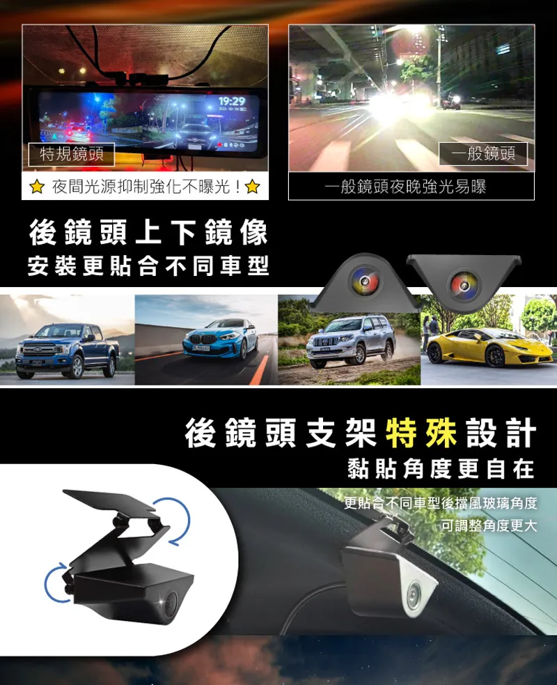 特規鏡頭19:29一般鏡頭☆ 夜間光源抑制強化不曝光!☆一般鏡頭夜晚強光易曝後鏡頭上下鏡像安裝更合不同車型後鏡頭支架特殊設計黏貼角度更自在更貼合不同車型後擋風玻璃角度角度更大