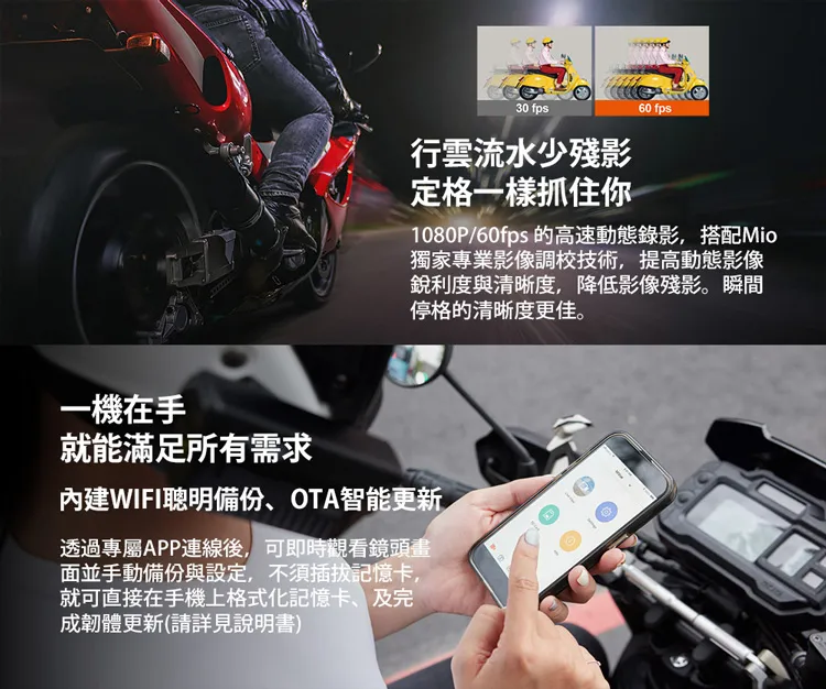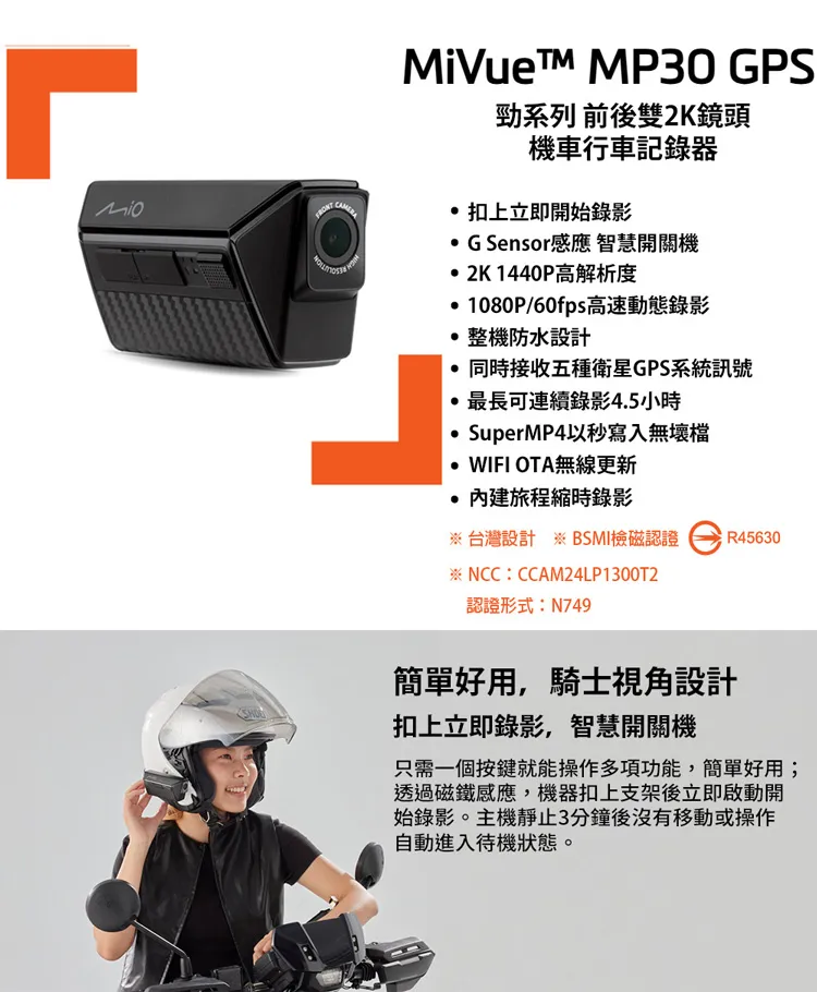 MiVue MP30 GPS 前後2K WIFI GPS HDR 前後雙鏡 機車行車記錄器(送64G U3)