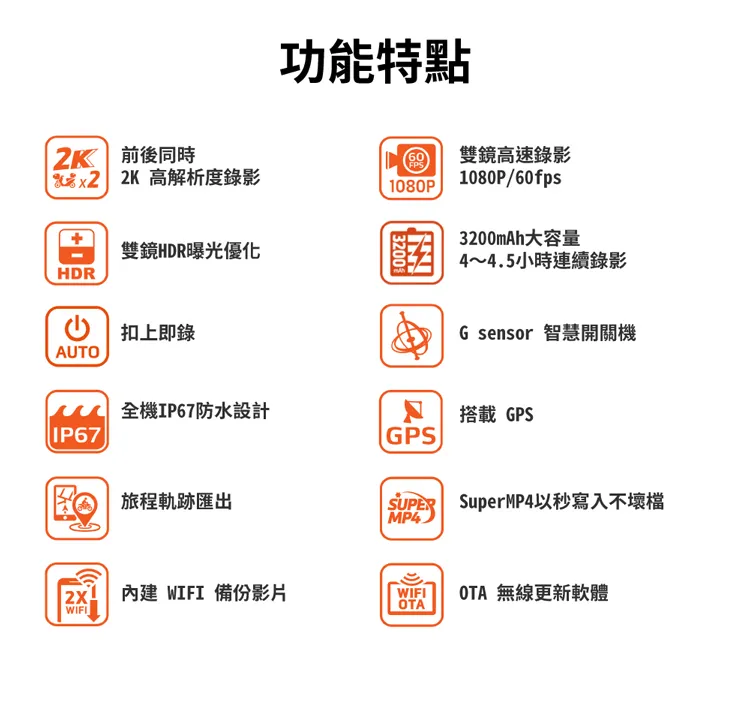3200mah大容量電池最長可連續錄影4.5小時 SuperMP4以秒寫入無壞檔 WIFI OTA無線更新軟體
