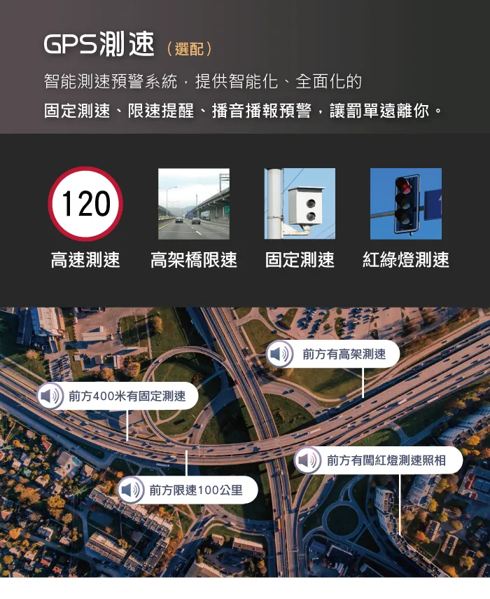GPS測速(選配)智能測速預警系統提供智能化、全面化的固定測速、限速提醒、播音播報預警,讓罰單遠離你。120高速測速 高架橋限速 固定測速 紅綠燈測速前方有高架測速前方400米有固定前方有闖紅燈測速照相前方限速100公里