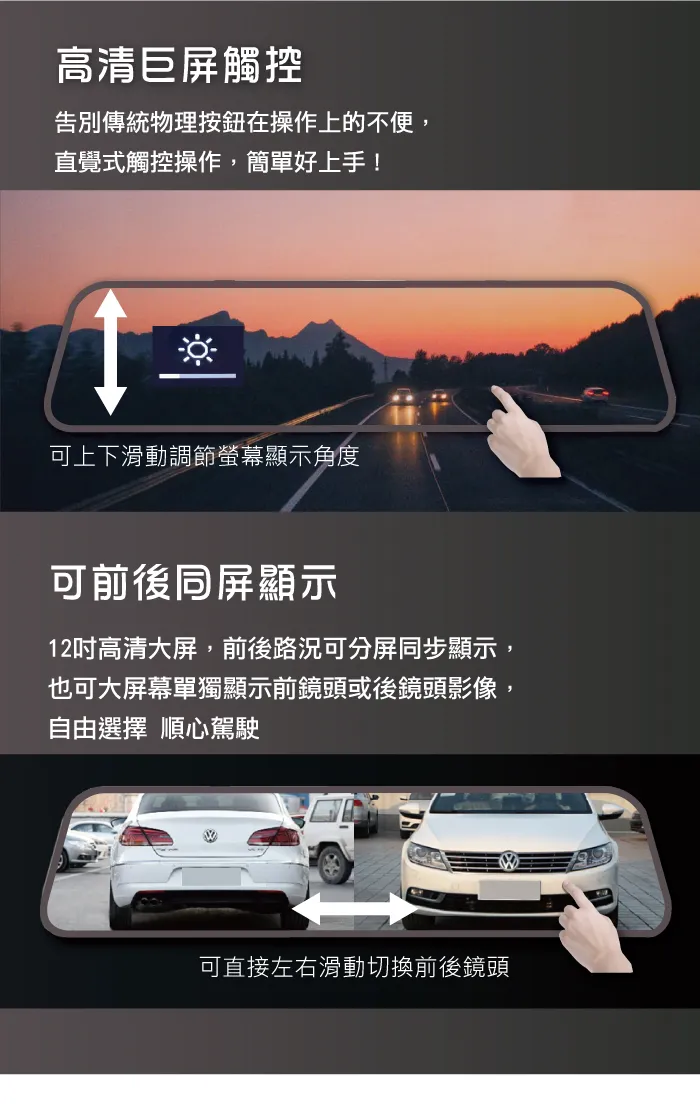 高清巨觸控告別傳統物理按鈕在操作上的不便,直覺式觸控操作,簡單好上手!可上下滑動調節螢幕顯示角度可前後同屏顯示12高清大屏,前後路況可分屏同步顯示,也可大屏幕單獨顯示前鏡頭或後鏡頭影像,自由選擇 順心駕駛可直接左右滑動切換前後鏡頭